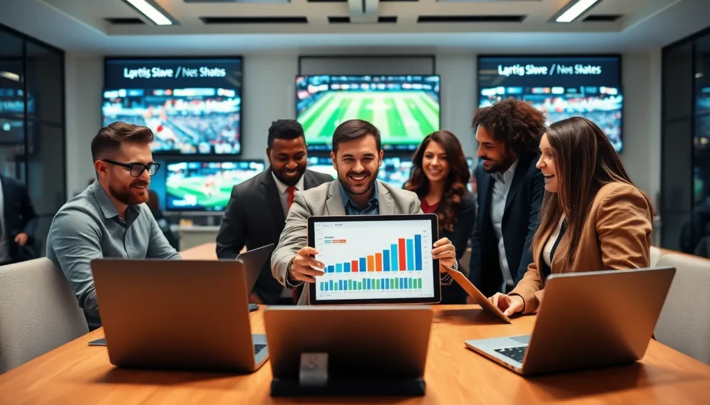 diverse team discussing sports news in a modern office setting.